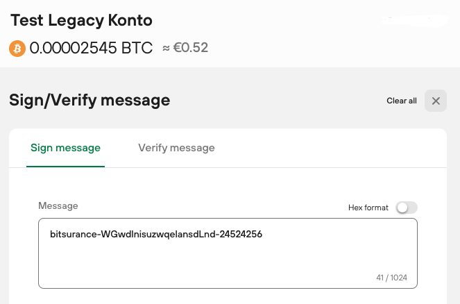 8. Kopiere die Signatur (Signature) und füge sie auf Bitsurance.eu ein.